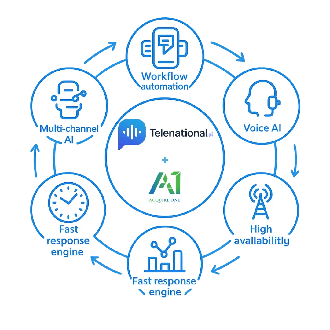 Instant replies, automatic bookings, consistent follow-ups, and an organised CRM — all within one simple Telenational platform, powered by Acquire One.