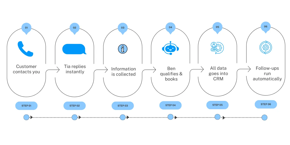 Ben and Tia manage calls, chats, and follow-ups so you can focus on growth.